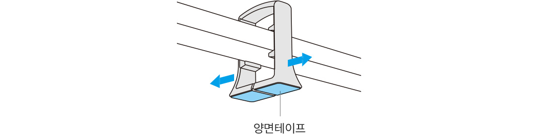 지지대의 양면테이프 필름을 벗겨낸 후 고정할 위치에 부착하여 스테이가 처지지 않도록 고정합니다.